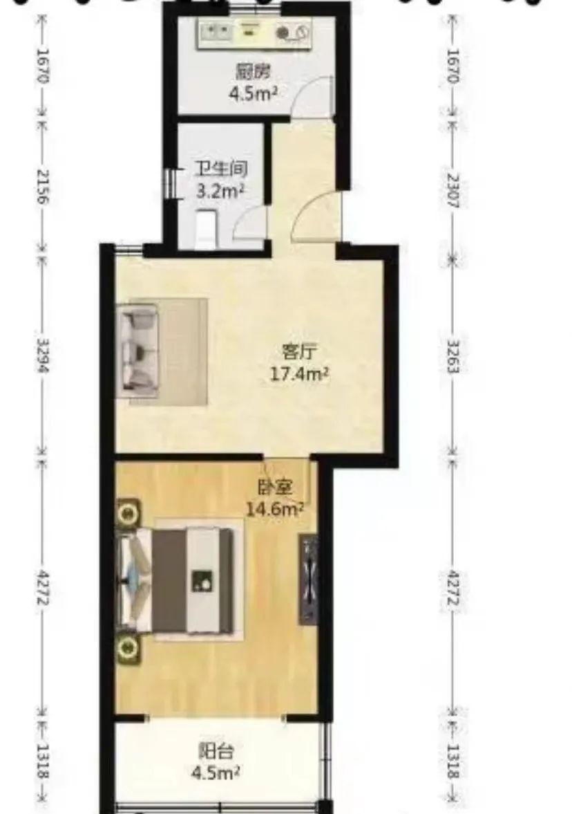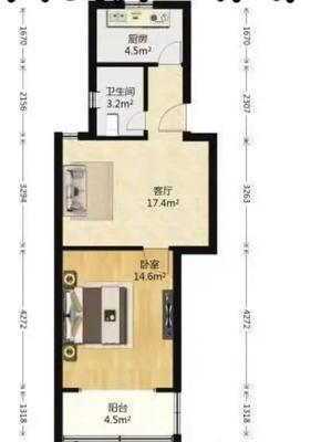 1室1厅1卫 面积45m² 1400元/月